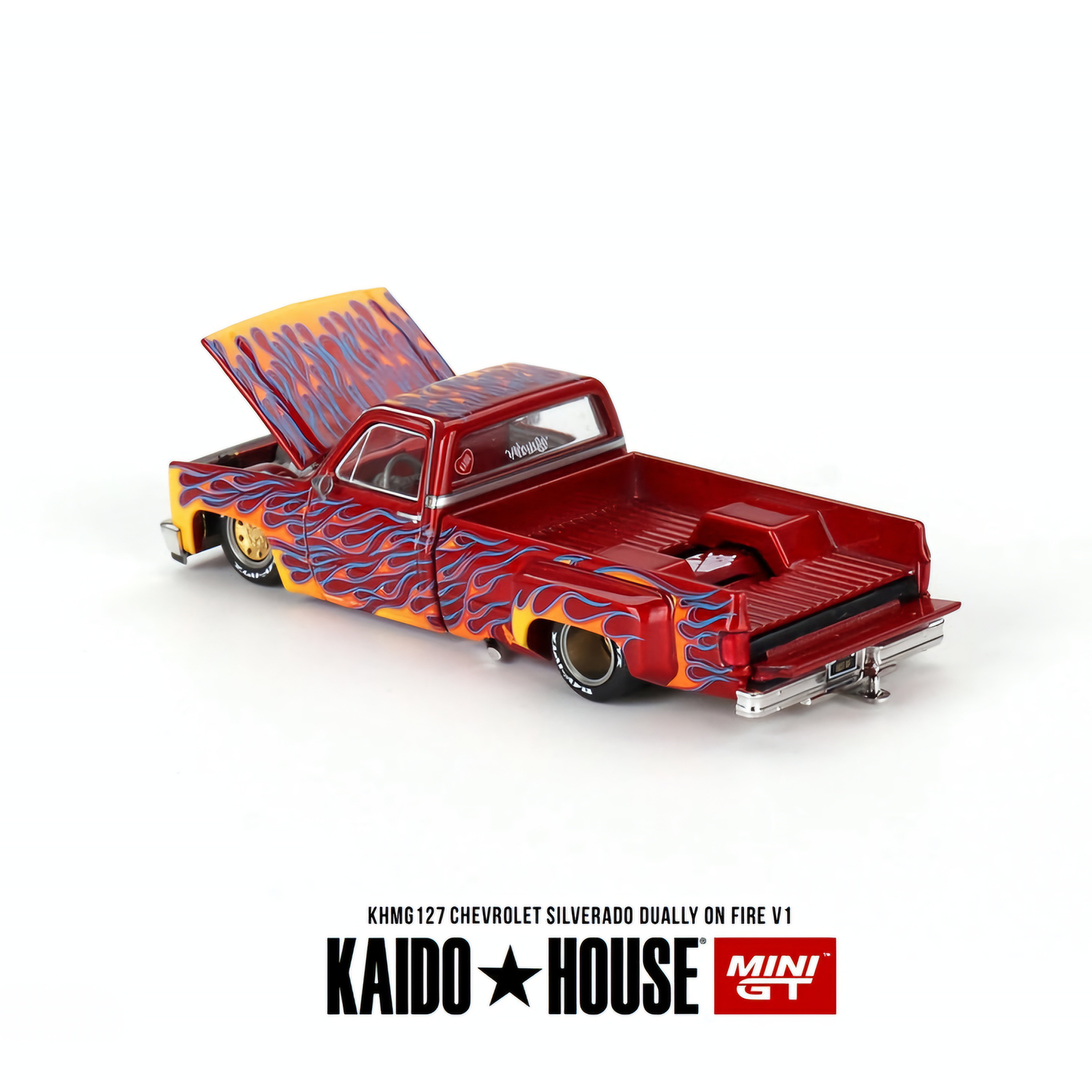 Kaido House X Mini GT Chevrolet Silverado Dually on Fire V1, Red with Flames